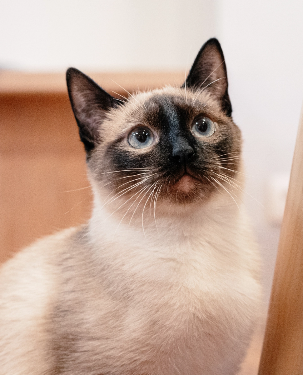 Een echte acrobaat die het liefst de hoogte opzoekt om alles goed in de gaten te houden. Met zijn sierlijke bewegingen en aanhankelijke karakter weet hij iedereen om zijn pootje te winden. Wanneer hij aandacht wil, kan hij luid miauwen om dit duidelijk te maken. Zijn nieuwsgierigheid kent geen grenzen; geen enkele deur is voor hem veilig, want hij móét weten wat zich erachter bevindt. Daarnaast geniet hij ervan om dicht tegen je aan te liggen op de bank. Wat zijn eetgewoonten betreft: hij geeft de voorkeur aan brokjes en laat snoepjes liever links liggen.